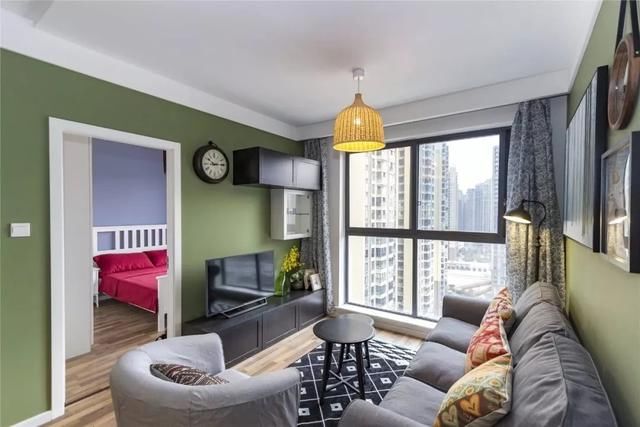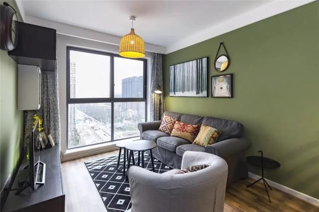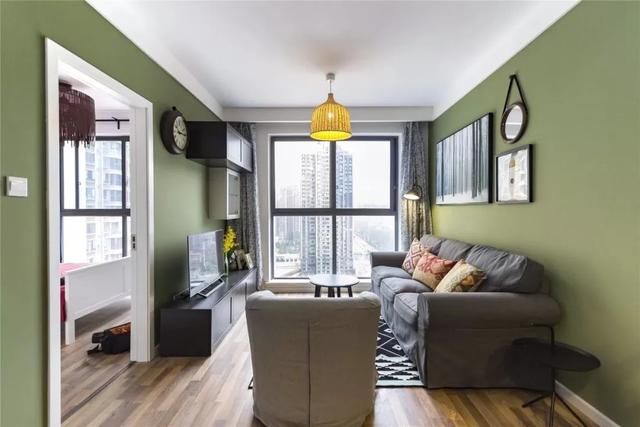 客厅面积较小,整体以茶绿色为主。