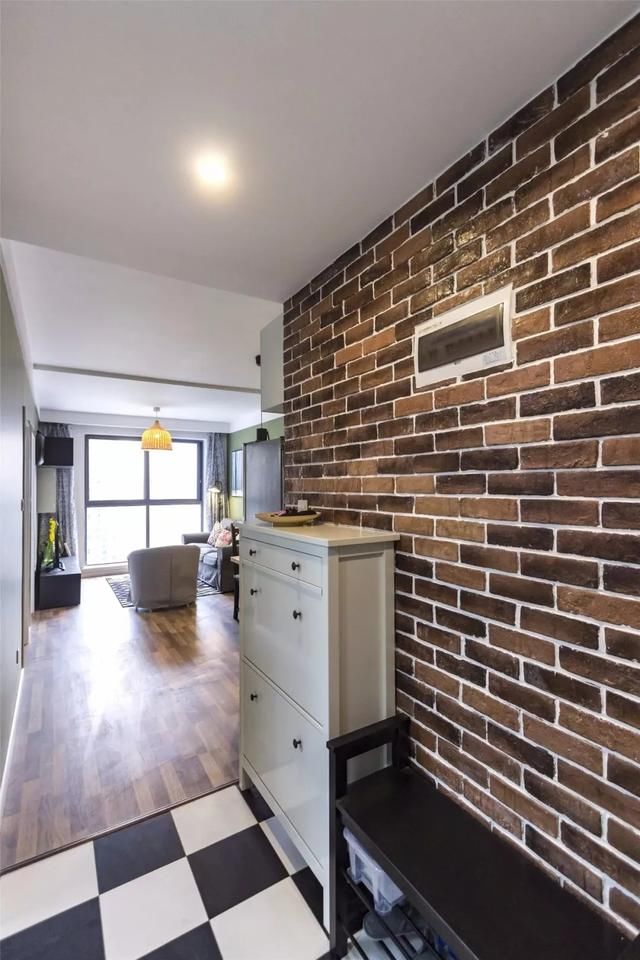 玄关以黑白交替的地砖,搭配上红砖墙面,营造出一个复古的工业感。