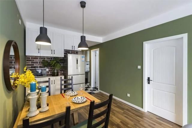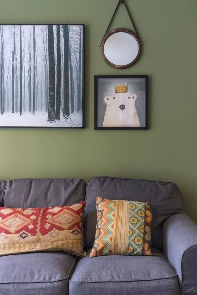 墙面也是与客厅一样的茶绿色,背景墙挂上一面圆形镜子。