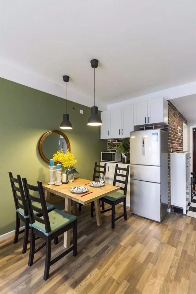 餐边柜一侧的墙面延伸了玄关的红砖墙,加入定制柜体与冰箱,实用温馨。