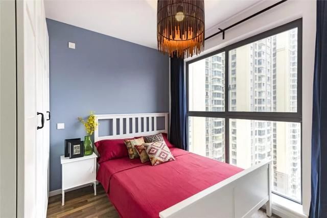 卧室在蓝色的墙面基础,白色衣柜、床体,搭配上一床红色的床单,强烈的颜色对比,更能突出视觉效果。